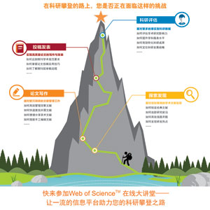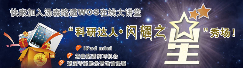 2015年汤森路透Web of ScienceTM春季在线大讲堂,不仅有高校专家和资深讲师与您一起,探寻经典文献的思想脉络,激发科研创新的灵感之光,还特别推出的“科研达人• 闪耀之星”秀场,为您提供一个展现才华、闪耀发光的广阔平台。我们相信,您在科研探索中积累的点滴心得、成功经验、应用技巧,都能成为自我闪耀的光亮之源和引导他人继续向上攀登的闪闪星光!