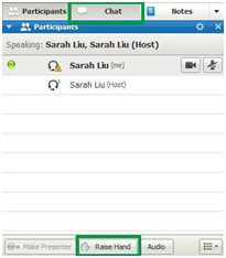 4当有疑问时,可在聊天窗口“Chats”输入文字进行实时交流,或在讨论环节点击“Raise Hand”举手发言提问、互动(确保电脑语音功能开启)。