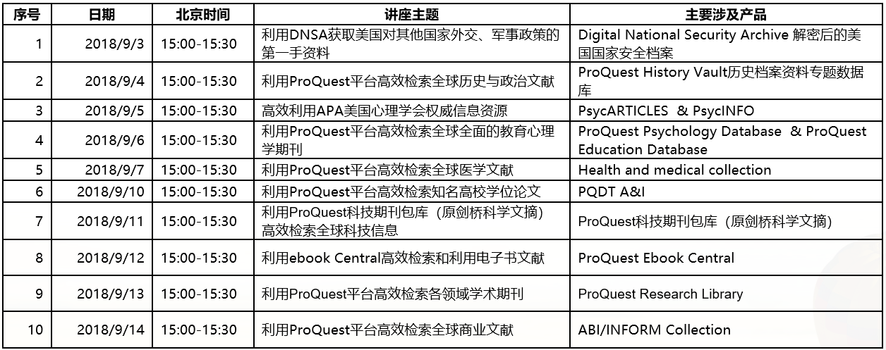 2018年9月网络培训课程安排如下(或关注ProQuest LibGuides):