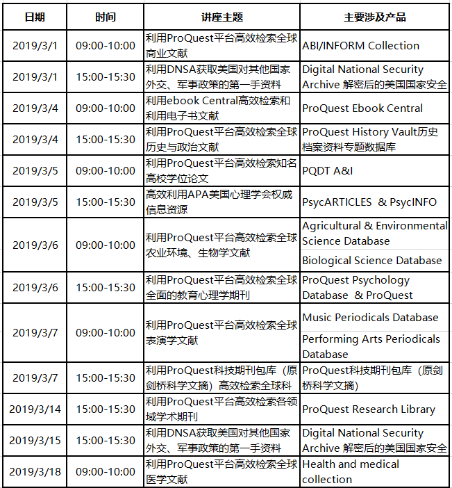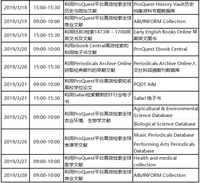 2019年3月网络培训课程安排如下(或关注ProQuest LibGuides):