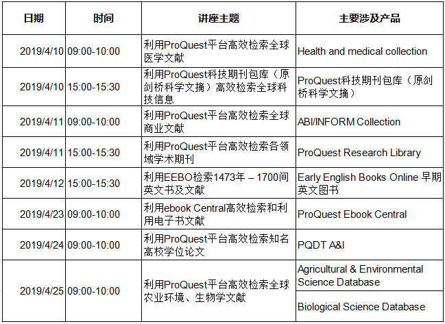 2019年4月网络培训课程安排如下(或关注ProQuest LibGuides):