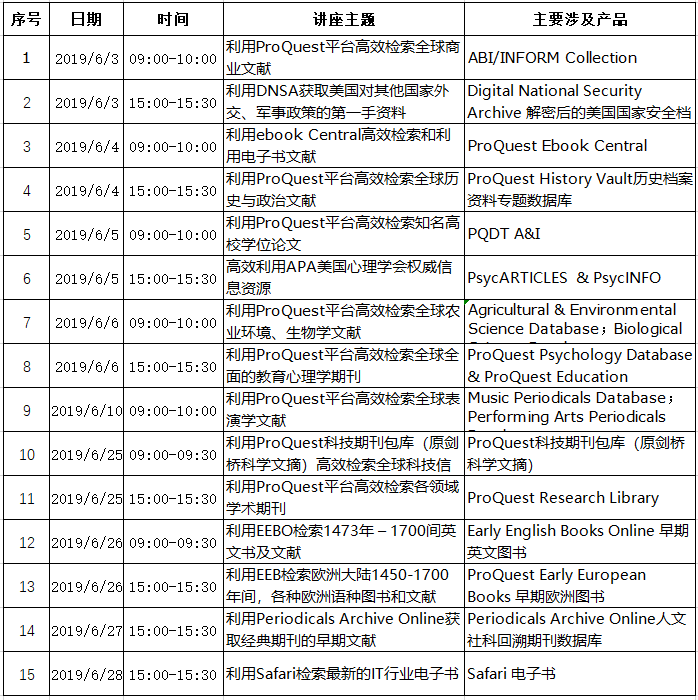 2019年6月网络培训课程安排如下(或关注ProQuest LibGuides):