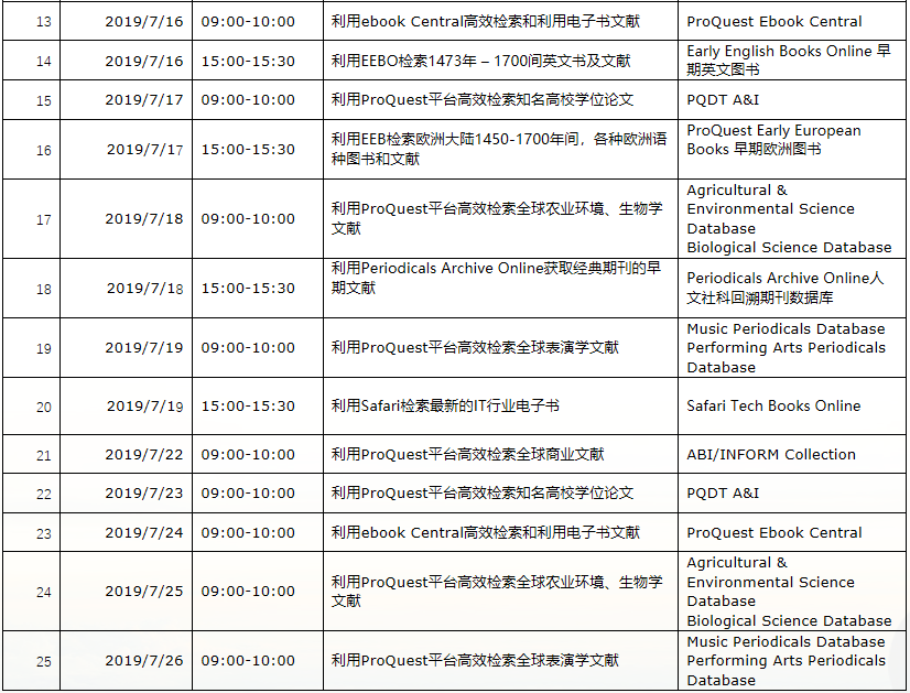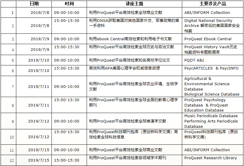 2019年7月网络培训课程安排如下(或关注ProQuest LibGuides):