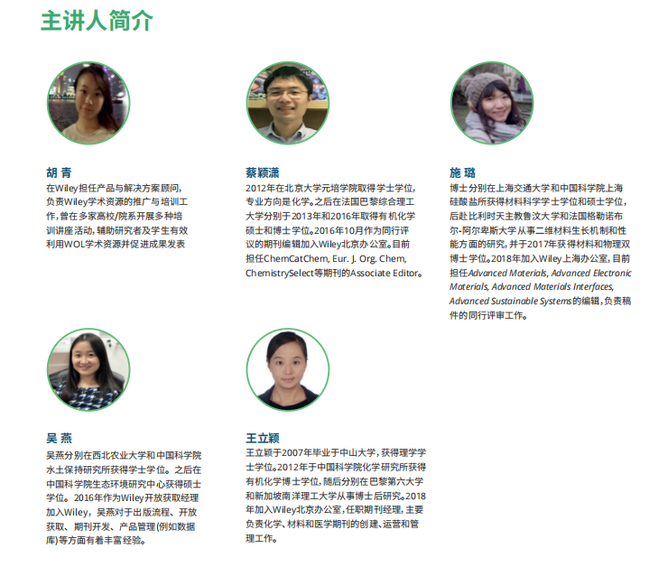 “Wiley在线讲堂”由Wiley培训顾问和资深编辑担任主讲,解答您在查找资源, 论文写作,投稿中的各种问题。只需一台电脑/手机/平板,即可参与。所有课程完 全免费开放!更有惊喜奖品送不停。