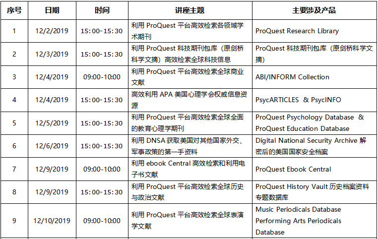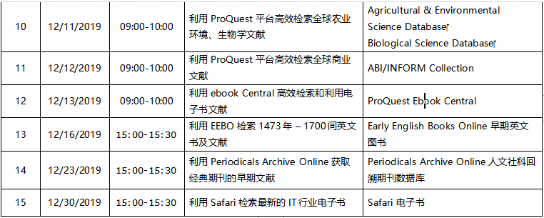 2019年12月网络培训课程安排如下(或关注ProQuest LibGuides):