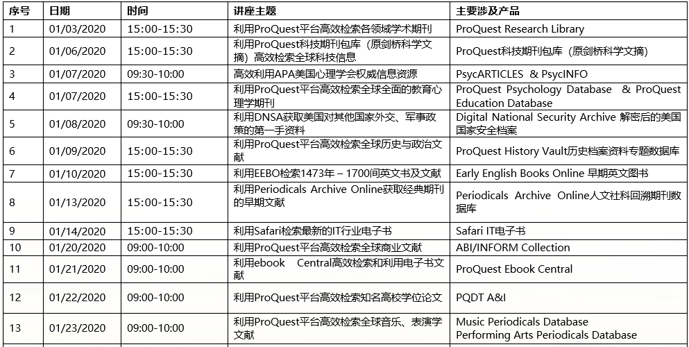 2020年1月网络培训课程安排如下(或关注ProQuest LibGuides):