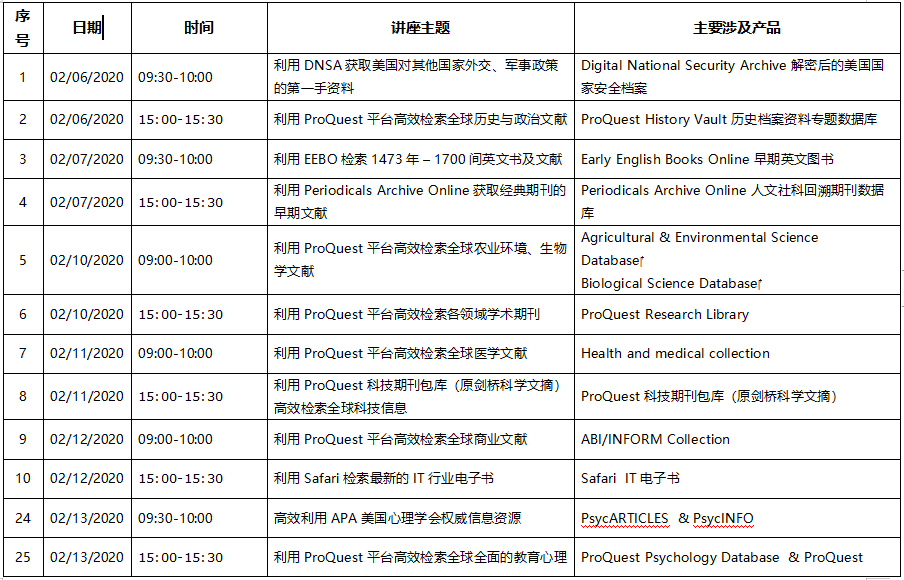 2020年2月网络培训课程安排如下(或关注ProQuest LibGuides):