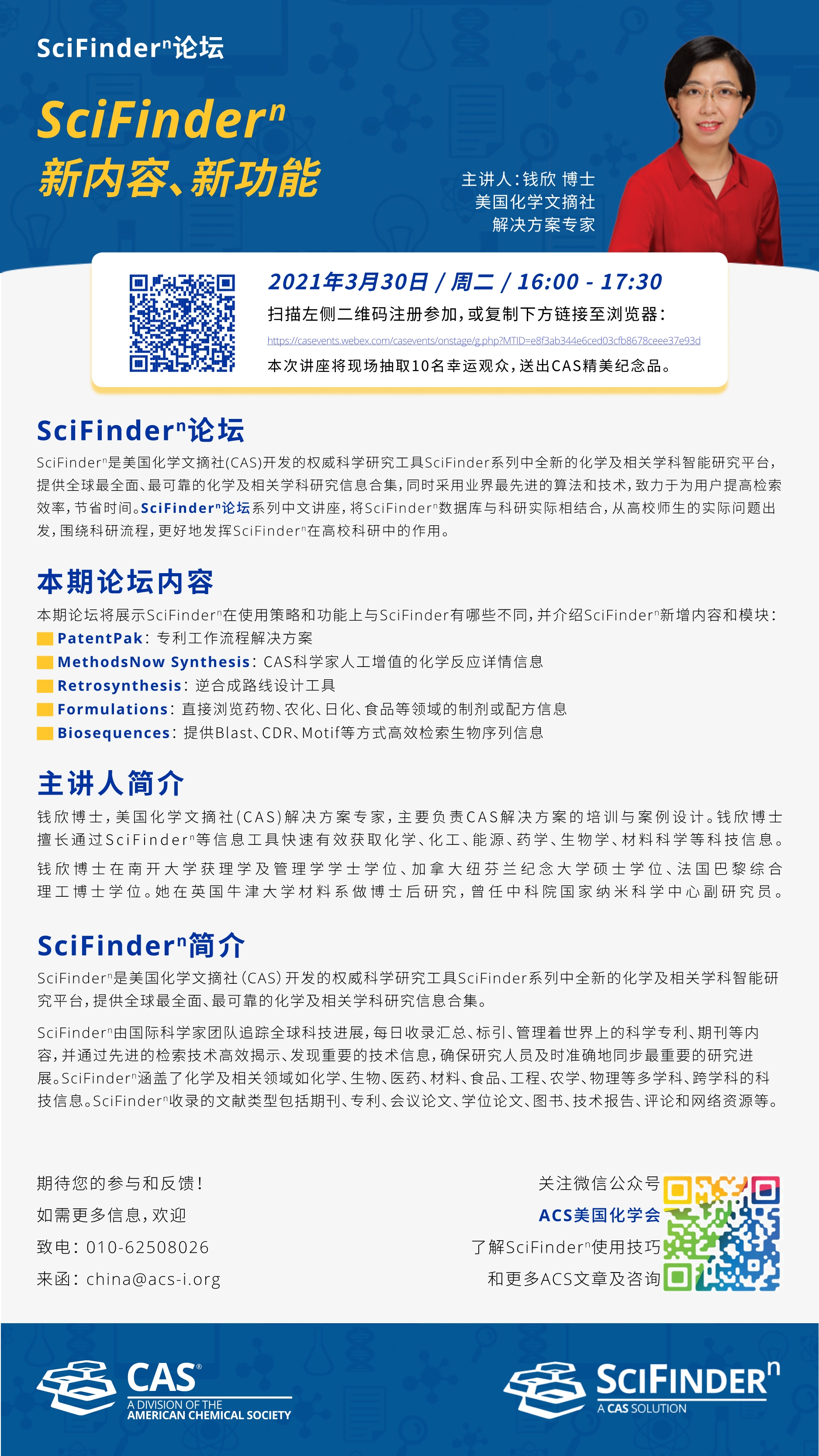 自2021年1月1日起,我校已升级至SciFindern 平台。美国化学文摘社(CAS)将于2021年3月30日下午4:00-5:30举办“SciFindern 论坛 | SciFindern新内容、新功能”。