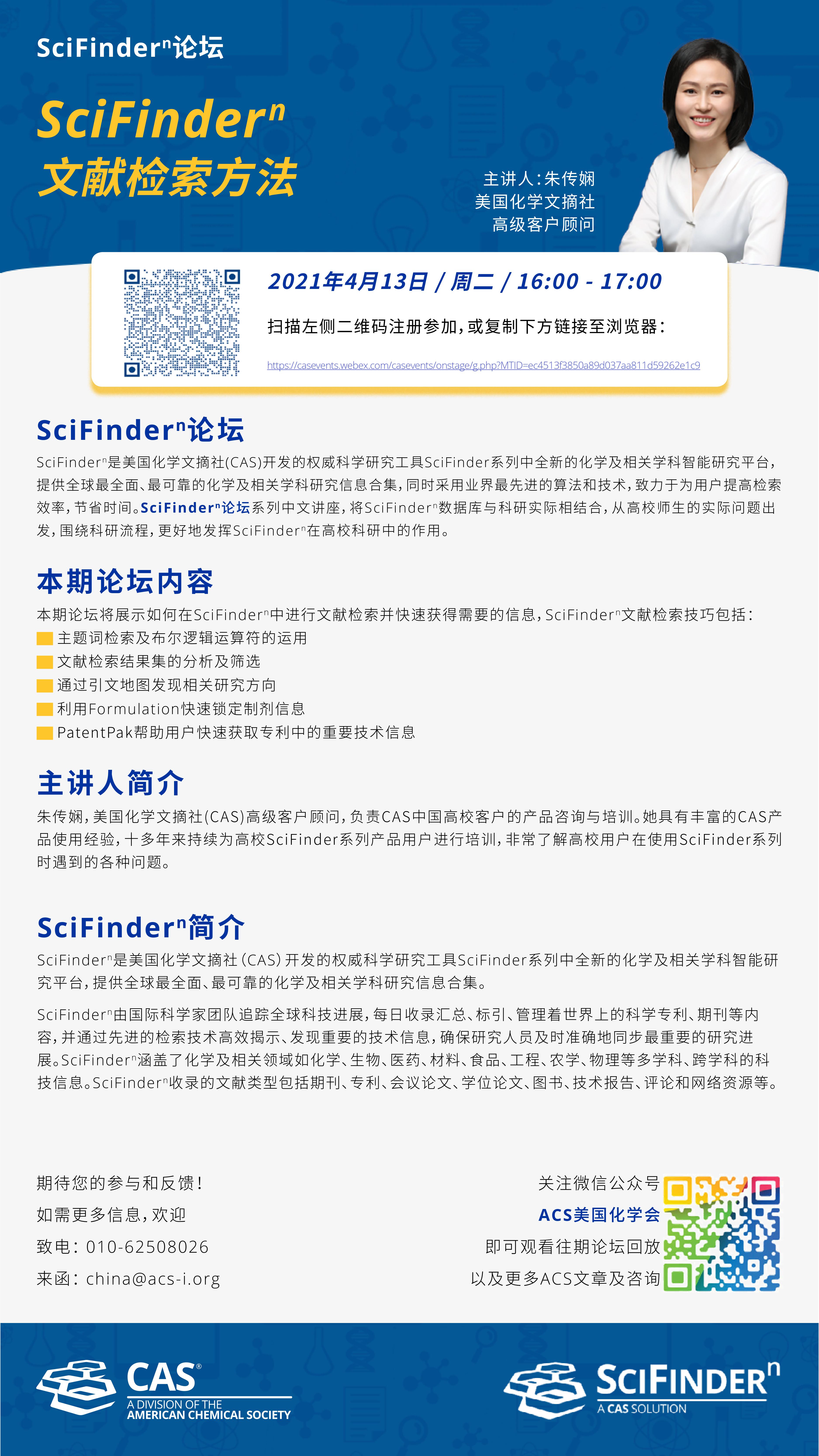 美国化学文摘社(CAS)将于2021年4月13日下午4:00-5:00举办“SciFindern 论坛 | SciFindern 文献检索方法”。
