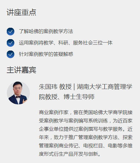 在本次在线专题研讨班中,我们特别邀请了来自湖南大学工商管理学院的朱国玮教授,分享他在案例教学上的一些实践分享与个人活用,诚挚邀请您的参加!同时,也欢迎您将本邮件转发给商学系所的相关同事,期盼各校商学院老师或同学能够一同上线参与讨论。