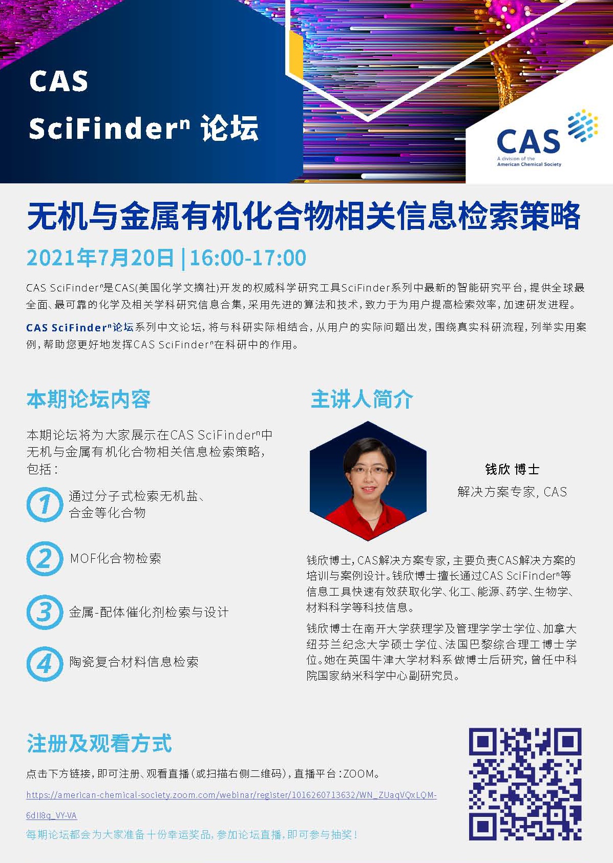 CAS 简介:美国化学文摘社(CAS) 是科学信息解决方案的领导者,致力于携手全球的创新者共同加速科学突破。CAS的1,400多名专家收录、关联和分析科学知识, 揭示数据中隐藏的关联。百年来,科学家、专利专家和商业人士依靠CAS的解决方案和专业知识,连接前人的科学发现和现有知识,揭示未被发现的数据关联,激发创新火花,预见加速增长的趋势和新机遇,探索更美好的未来。 CAS SciFindern简介:CAS SciFindern是美国化学文摘社(CAS)开发的权威科学研究工具CAS SciFinder系列中全新的化学及相关学科智能研究 平台,提供全球最全面、最可靠的化学及相关学科研究信息合集。CAS SciFindern由国际科学家团队追踪全球科技进 展,每日收录汇总、标引、管理着世界上的科学专利、期刊等内容,并通过CAS SciFinderⁿ中包含的先进检索技术高 效揭示、发现重要的技术信息,确保研究人员及时准确地同步最重要的研究进展。CAS SciFindern涵盖了化学及相关 领域如化学、生物、医药、材料、食品、工程、农学、物理等多学科、跨学科的科技信息。CAS SciFindern收录的文 献类型包括期刊、专利、会议论文、学位论文、图书、技术报告、评论和网络资源