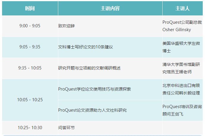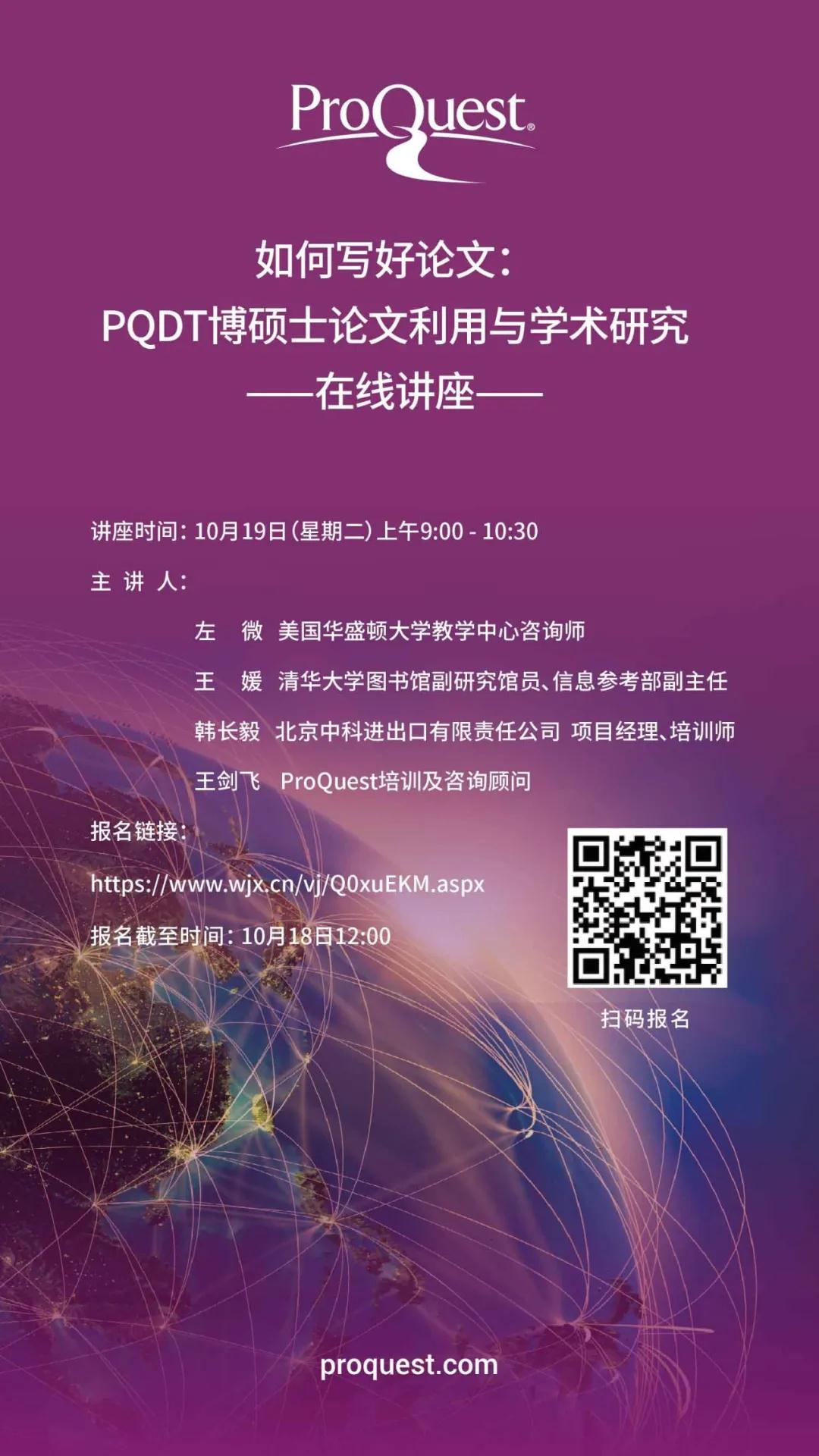 10月19日上午,ProQuest公司将举办 “如何写好论文:PQDT博硕士论文利用与学术研究” 在线讲座,特邀请华盛顿大学左微博士、清华大学图书馆副研究馆员王媛老师为大家带来如何高效地撰写博士论文,如何进行论文的选题、构思等方面的策略与宝贵经验。讲座中,北京中科进出口公司韩长毅经理, ProQuest培训及咨询顾问王剑飞还将从学术研究需求出发,通过案例方式,为大家详细讲解如何检索与利用PQDT博硕士论文数据库开展论文撰写与学术研究。本次讲座将通过腾讯会议方式推出。欢迎大家参加!