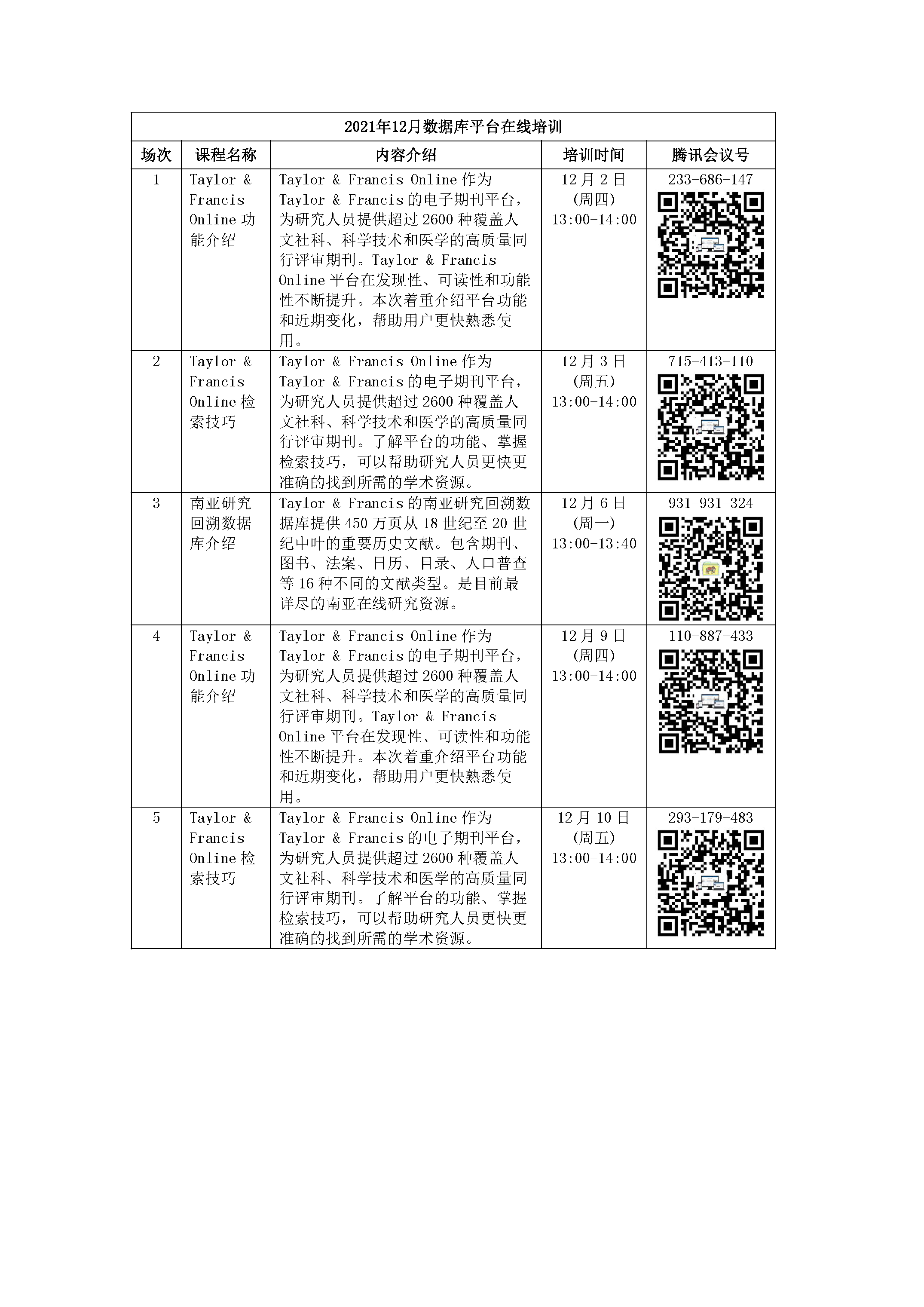 Taylor & Francis 2021年数据库平台 冬季在线网络课程表(12月)