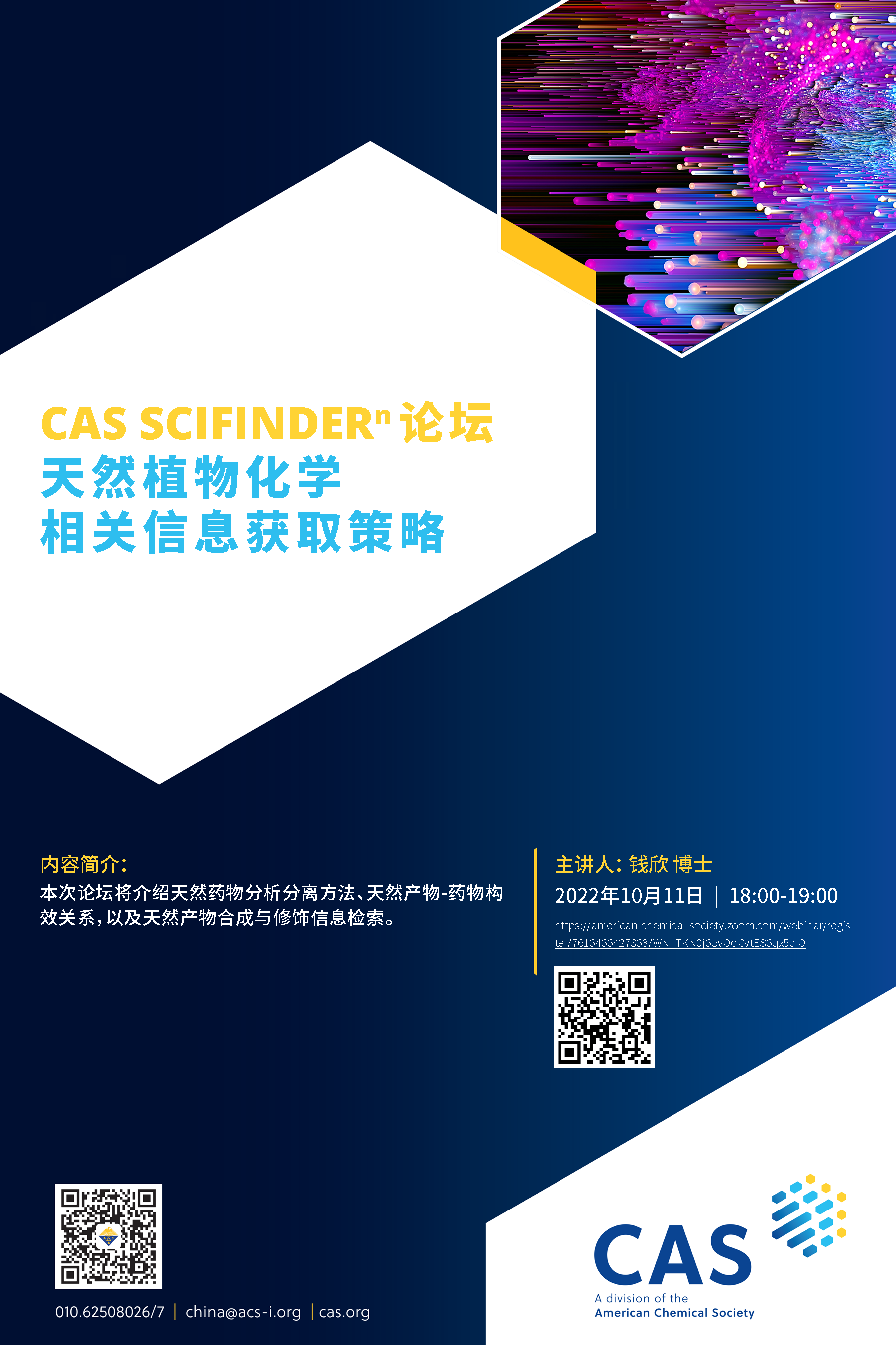 CAS SciFindern简介:CAS SciFindern是CAS(美国化学文摘社)开发的权威科学研究工具CAS SciFinder系列中全新的化学及相关学科智能研究平台,提供全球最全面、最可靠的化学及相关学科研究信息合集,同时采用业界最先进的算法和技术,致力于为用户提高检索效率,加速研发进程。 本期论坛将聚焦:本期论坛将介绍天然药物分析分离方法,天然产物-药物构效关系,天然产物合成与修饰信息检索