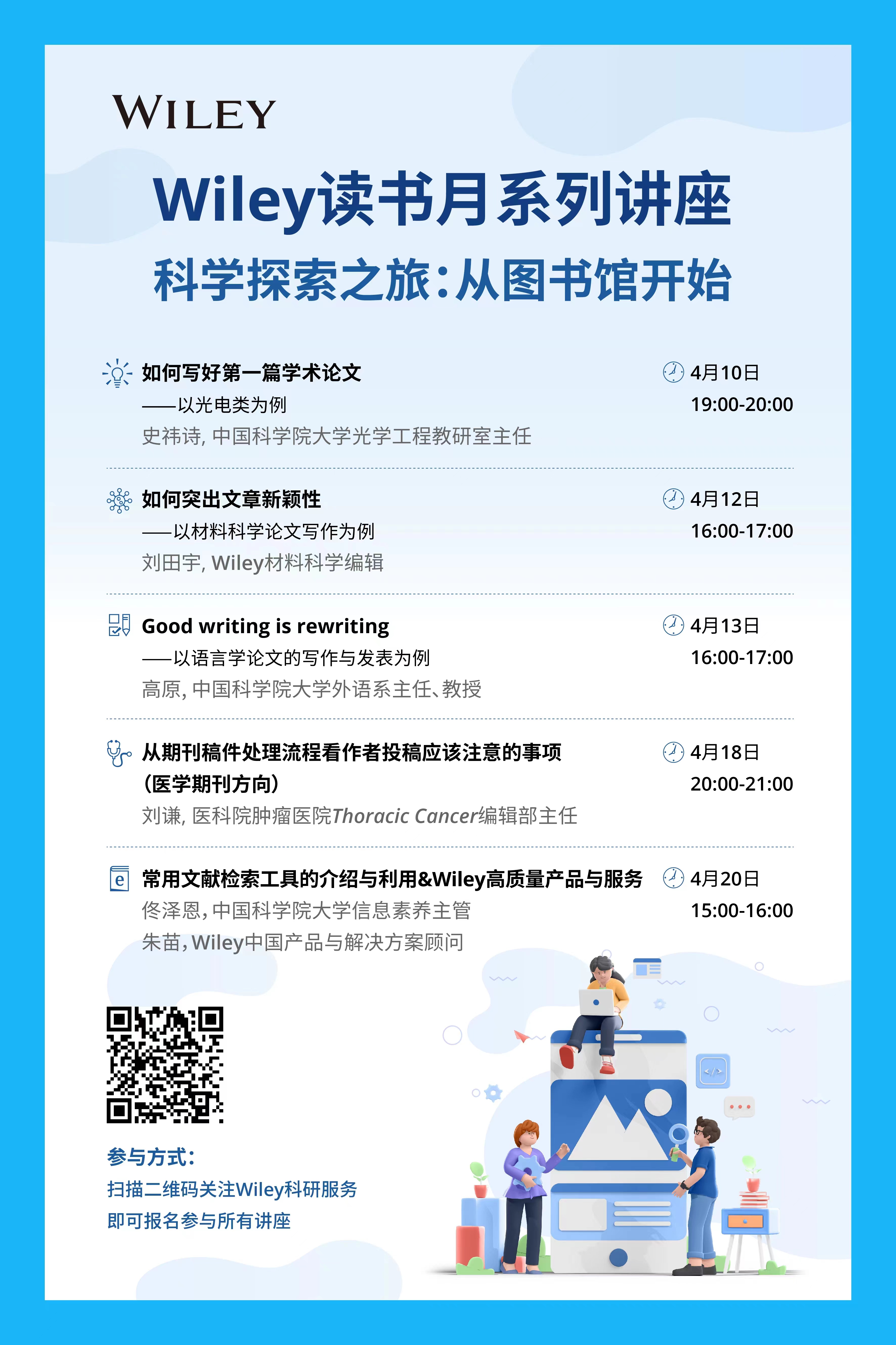 Wiley在读书日来临之际,与中国科学院文献情报中心、中国科学院大学图书馆共同推出以“科学探索之旅:从图书馆开始”为主题的系列活动,将邀请活跃在学术前沿、经验丰富的专家学者和Wiley资深科研出版行业的编辑顾问,以不同学科为例,分享学术写作经验和心得。此次系列讲座将举办5场,时间为4月10日至4月20日,均采用线上直播形式,方便观众随时随地参与。快来报名参与吧,学习常用的科研文献检索技巧,掌握科研论文写作的基本规范和技巧,开启你的科研之旅。