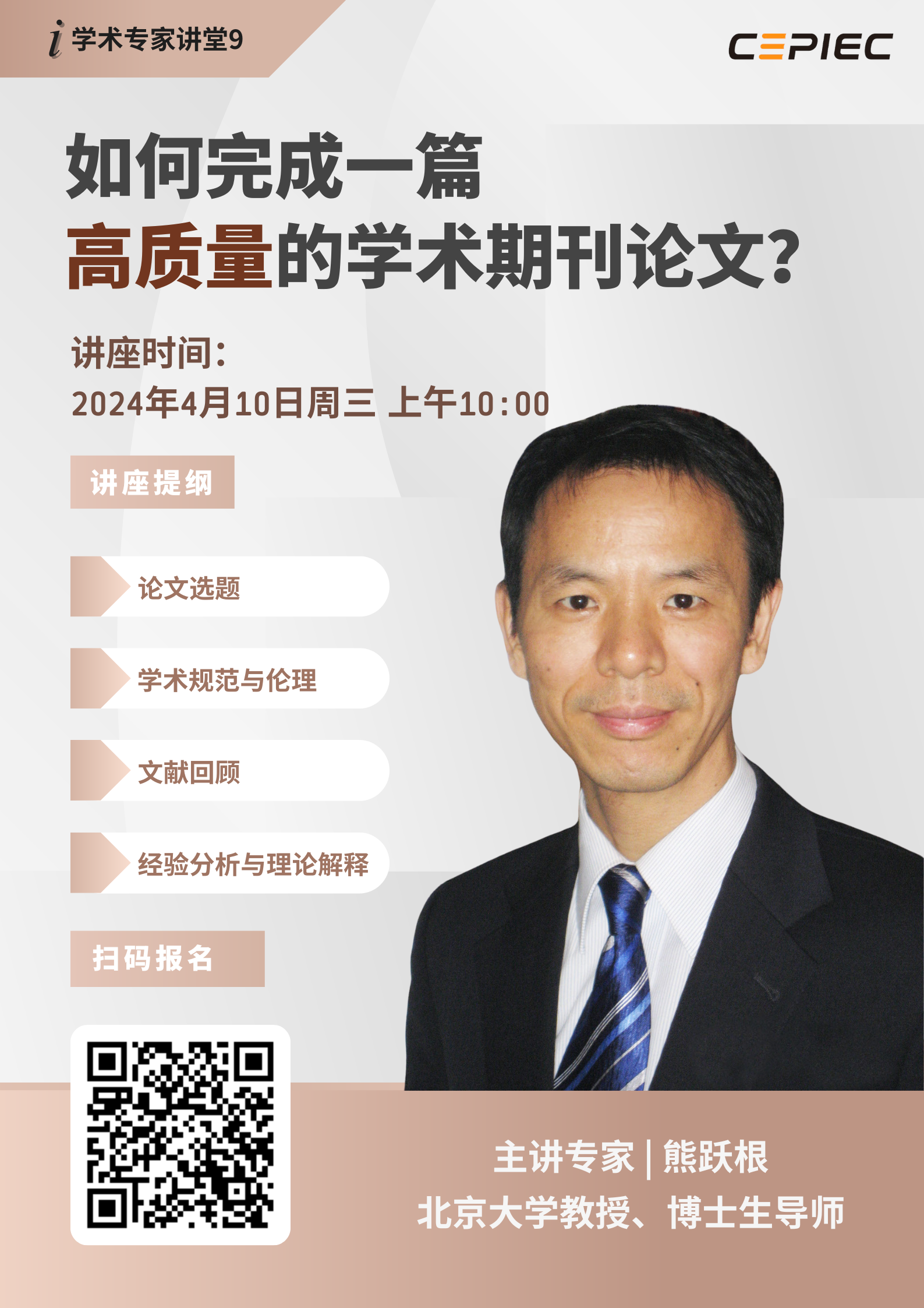 感谢贵馆长期以来对“i学术专家讲堂”的大力支持。本期直播讲座,荣幸邀请到北京大学熊跃根教授,从国内核心期刊以及国际期刊的发表要求出发,围绕选题、学术规范与伦理、文献回顾等角度,为大家带来关于《如何完成一篇高质量的学术期刊论文》的主题讲座。 讲座还有互动问答、幸运抽奖等环节,诚邀贵馆组织师生报名参加!我们可提供秀米推文排版或开通公众号白名单等宣传服务。 讲座时间:2024年4月10日(周三) 10: 00 讲座详情:https://mp.weixin.qq.com/s/rMdJIapzM3SacW11aR_sJw