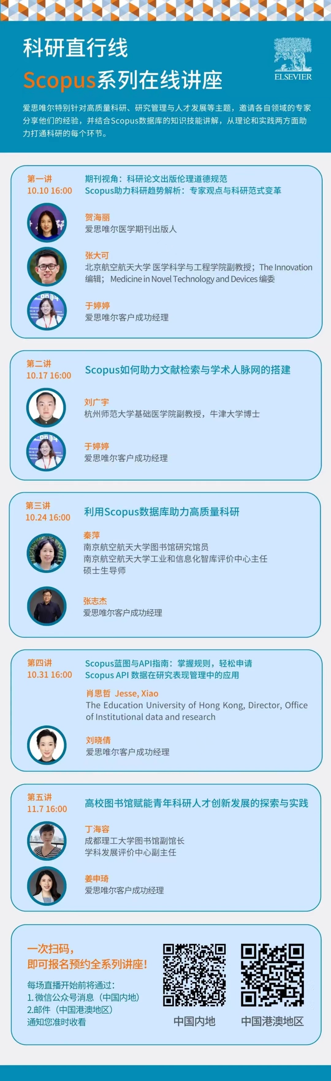 为此,爱思唯尔特别针对高质量科研、研究管理与人才发展等主题,邀请各自领域的专家分享他们的经验,并结合Scopus数据库的知识技能讲解,举办“科研直行线”Scopus系列在线讲座,从理论和实践两方面助力打通科研的每个环节。