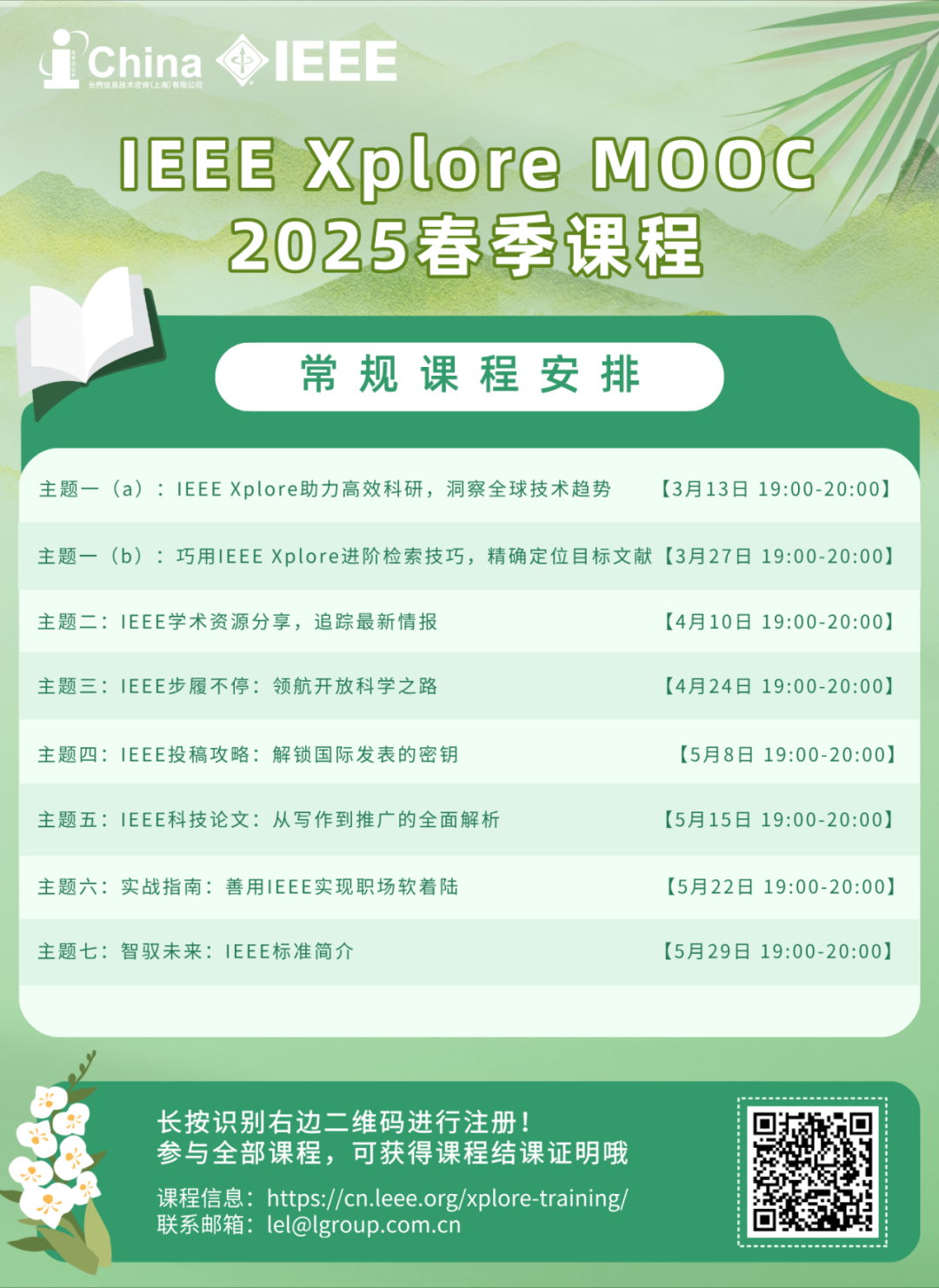 “春风得意马蹄疾,一日看尽长安花。”在这个充满希望的季节,IEEE Xplore MOOC 2025春季课程带您领略科技前沿,收获科研硕果!