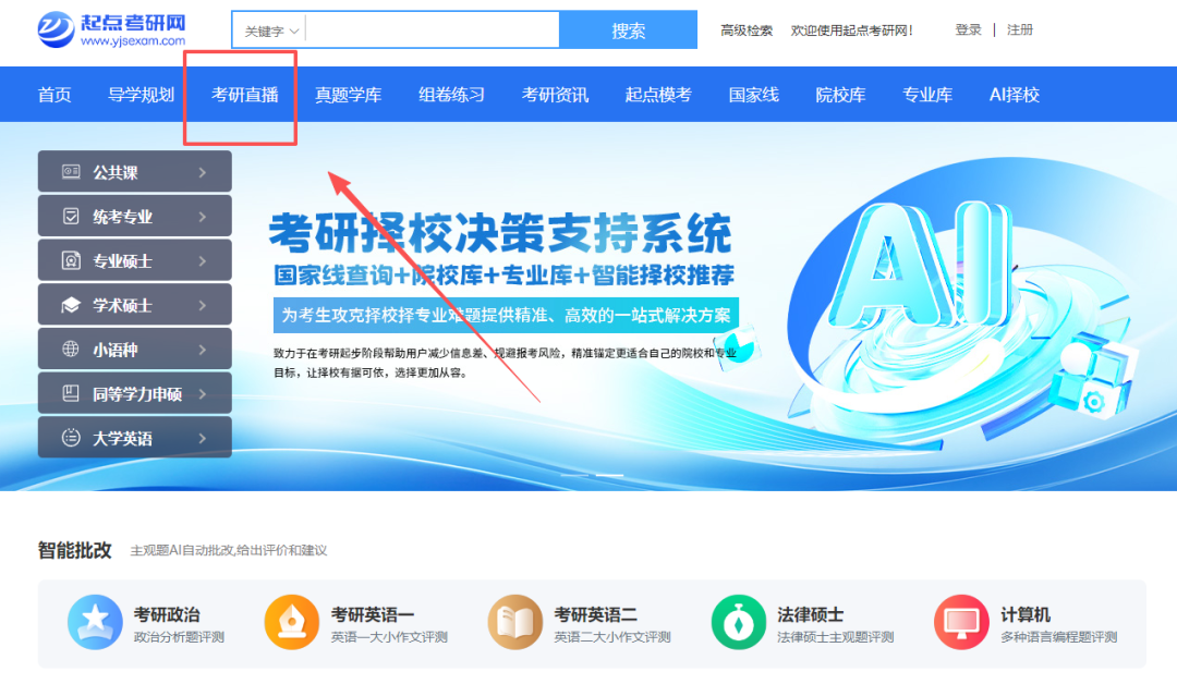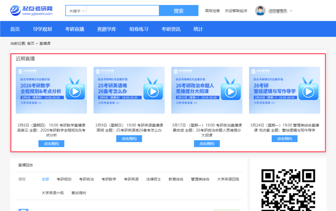 直播课结束后,可登录起点考研网观看回放(注:注册登录后才可观看视频)