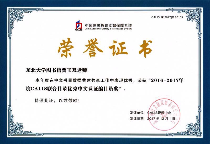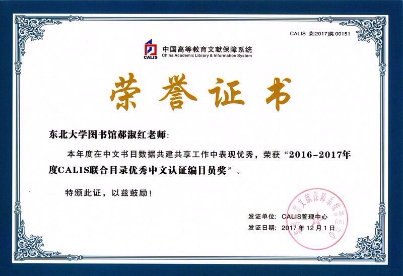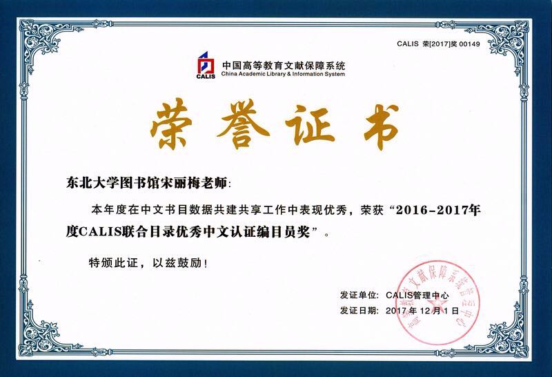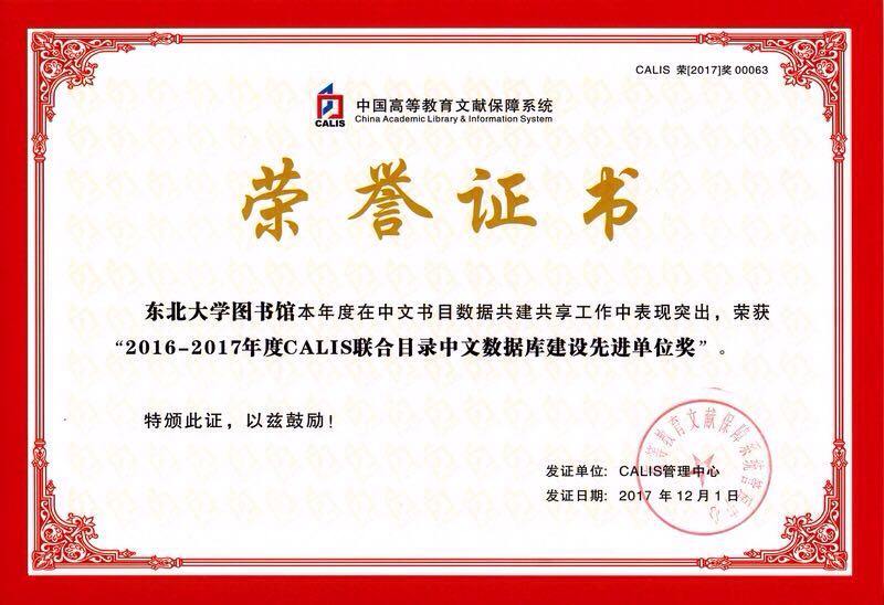 CALIS联机合作编目中心对2016-2017年度CALIS联合目录各项工作指标进行了统计,并组织专家对数据质量进行评估,东北大学图书馆在“2016-2017年度CALIS联合目录中文书目数据上载量TOP30”中名列第13位,荣获“2016-2017年度CALIS联合目录中文数据库建设先进单位奖”;宋丽梅、郝淑红、贾玉双在“2016-2017年度CALIS中文认证编目员书目数据上载量TOP 30”中分别位列第19、21、23位,荣获“2016-2017年度CALIS联合目录优秀中文认证编目员奖”。