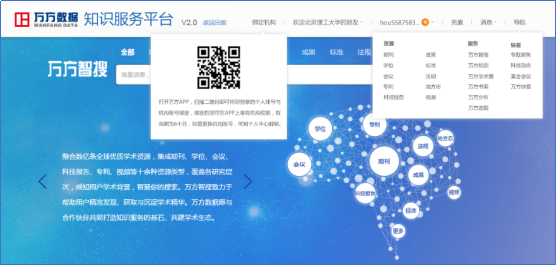 1)PC登录万方主页,打开PC版万方数据知识服务平台,页面上方显示“绑定机构”二维码。