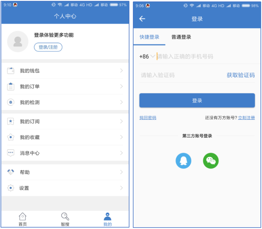 2)打开万方数据APP,进入个人中心,点击“登录/注册”,登录待绑定的个人账号。(如果没有万方个人账号需要先注册)