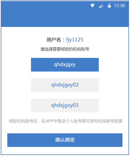 4)选择需要绑定的机构账号,点击“确认绑定”即可。