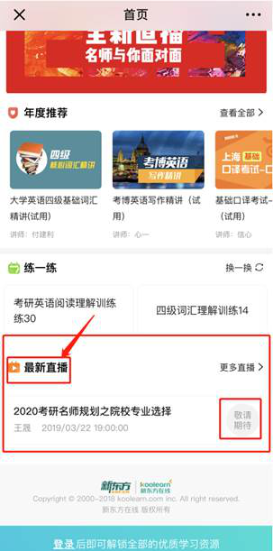 馆外访问,输入新东方多媒体学习库网址:library.koolearn.com,登陆个人账号(个人账号需在馆内环境下注册好),点击上方“直播课”,进入直播频道。
