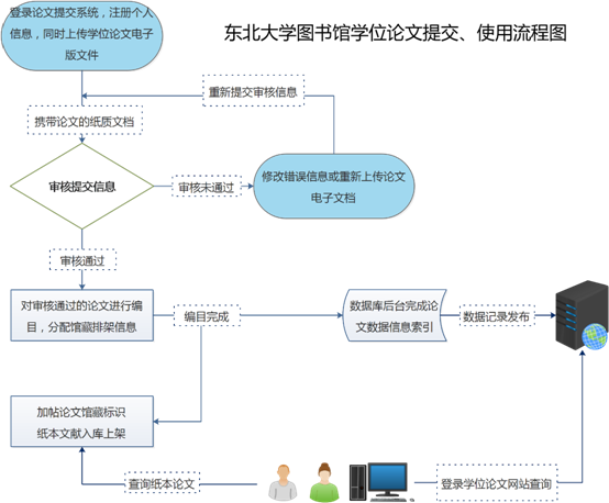 (8)查询东北大学硕士、博士论文的读者,可以通过浏览东北大学图书馆学位论文管理系统,通过系统提供的相应检索字段查询到论文电子文档。也可以直接到图书馆二楼服务台浏览学位论文纸质版文档。
