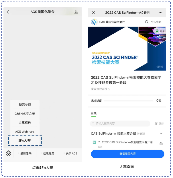 参与方式:关注微信公众号“ACS美国化学会”, 点击进入“SFn大赛”菜单,填写注册信息后进入课程学习: