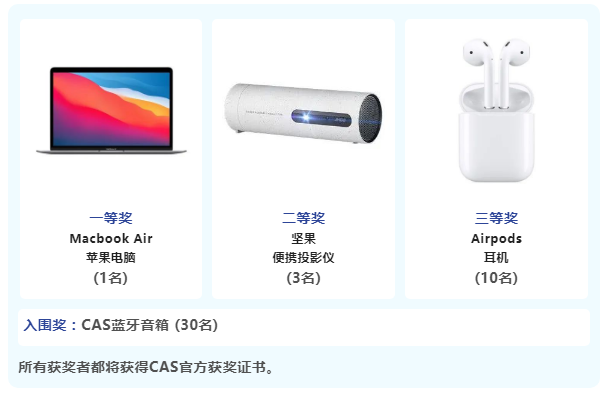 第一轮考核成绩优秀的学员都将获得CAS颁发的第一轮获奖纸质证书;进入第二轮考核的学员将有机会获得Macbook Air、坚果投影仪、Airpods等大奖及入围奖,并获得大赛证书。具体报名、参赛及颁奖流程如下: