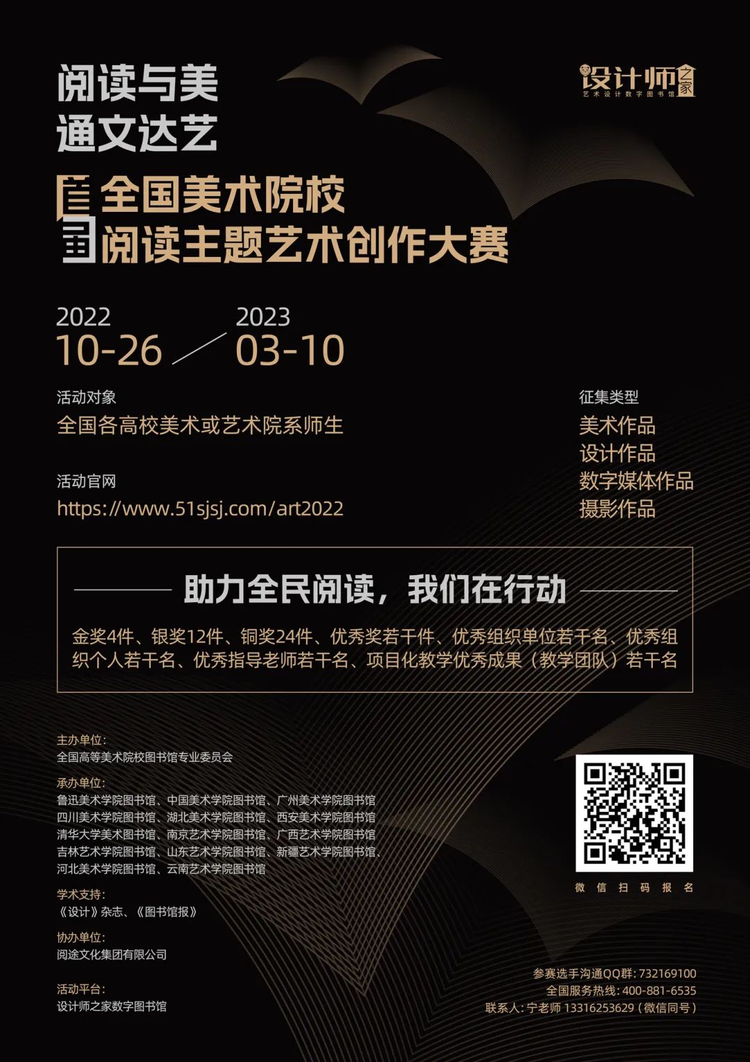 本次活动面向全国各高校美术或艺术院系师生,征集阅读主题相关的艺术作品,包括美术作品、设计作品、数字媒体作品、摄影作品四类作品。参赛选手通过活动平台在线报名并提交作品。