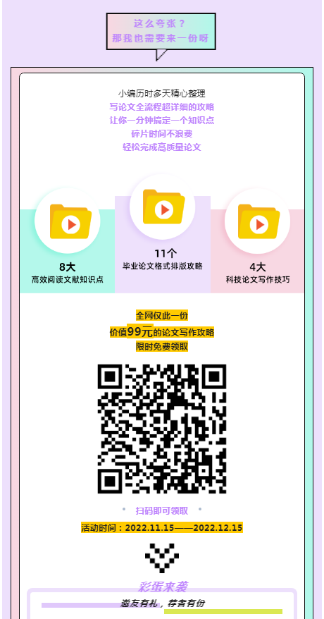 论文(设计)是大学生的一门必修课程,更是对自己在学习期间对学术成果的一次阶段性总结,也是对自己所学知识的一次综合展示,是利用书本知识解决实际问题的一次实战演练。完成一篇高质量文章,也会在自己学术履历上锦上添花。但很多同学们对于选择论文题目、怎样写论文以及论文的格式还有很多困惑。如果你也是这样的话,那就一定要看我们精心为你准备的“论文写作攻略”哦~