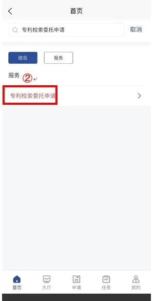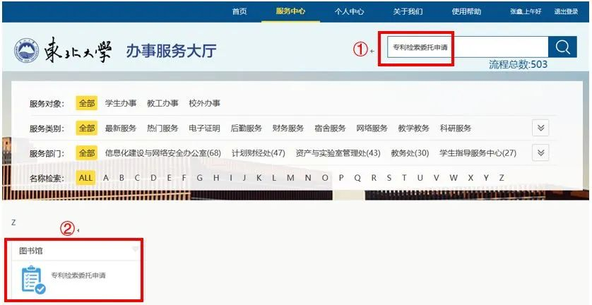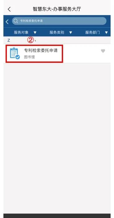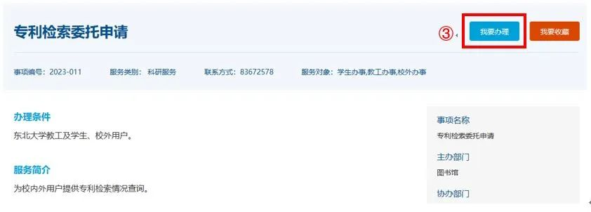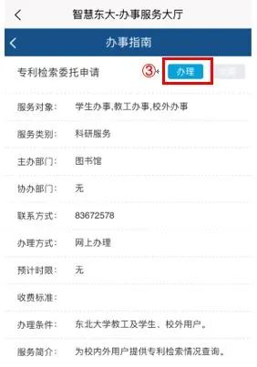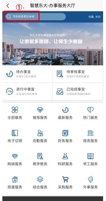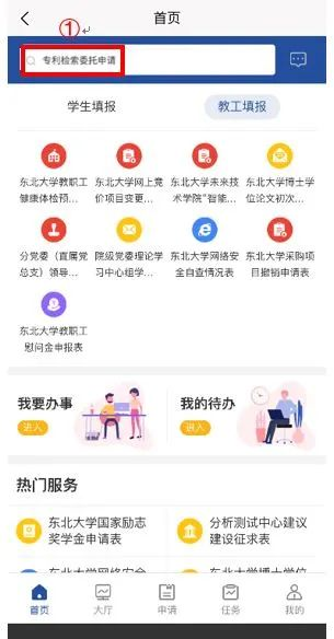 使用电脑端浏览器访问东北大学办事服务大厅(https://ehall.neu.edu.cn/db_ portal/index_)或使用手机端智慧东大APP进入“办事大厅”,在首页搜索框中查找“专利检索委托申请”或“专利查新委托申请”或“专利分析委托申请”,点击进入流程,选择“我要办理”提交申请。