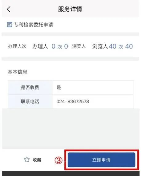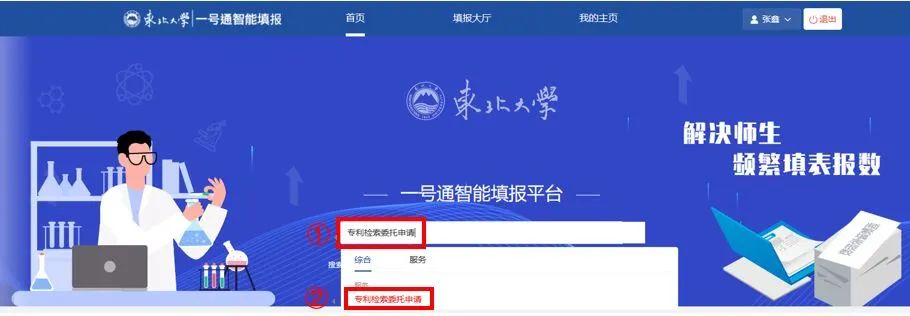 使用电脑端浏览器登录东北大学“一号通智能填报”(https://ehall.neu.edu.cn/ service/v2/site/index)或使用手机端智慧东大APP进入“一号通智能填报”,在首页搜索框中查找“专利检索委托申请”或“专利查新委托申请”或“专利分析委托申请”,点击进入流程,选择“立即申请”提交申请。