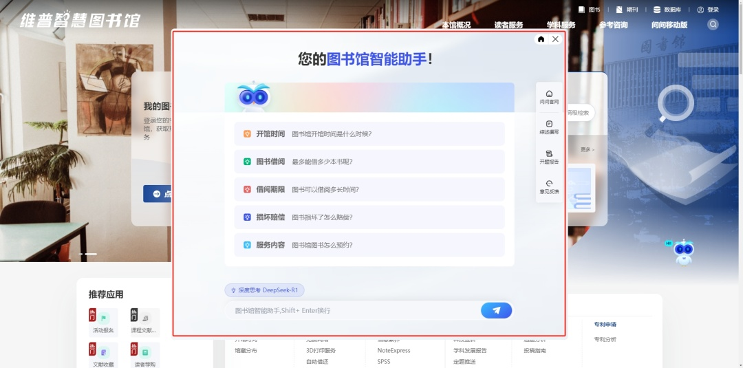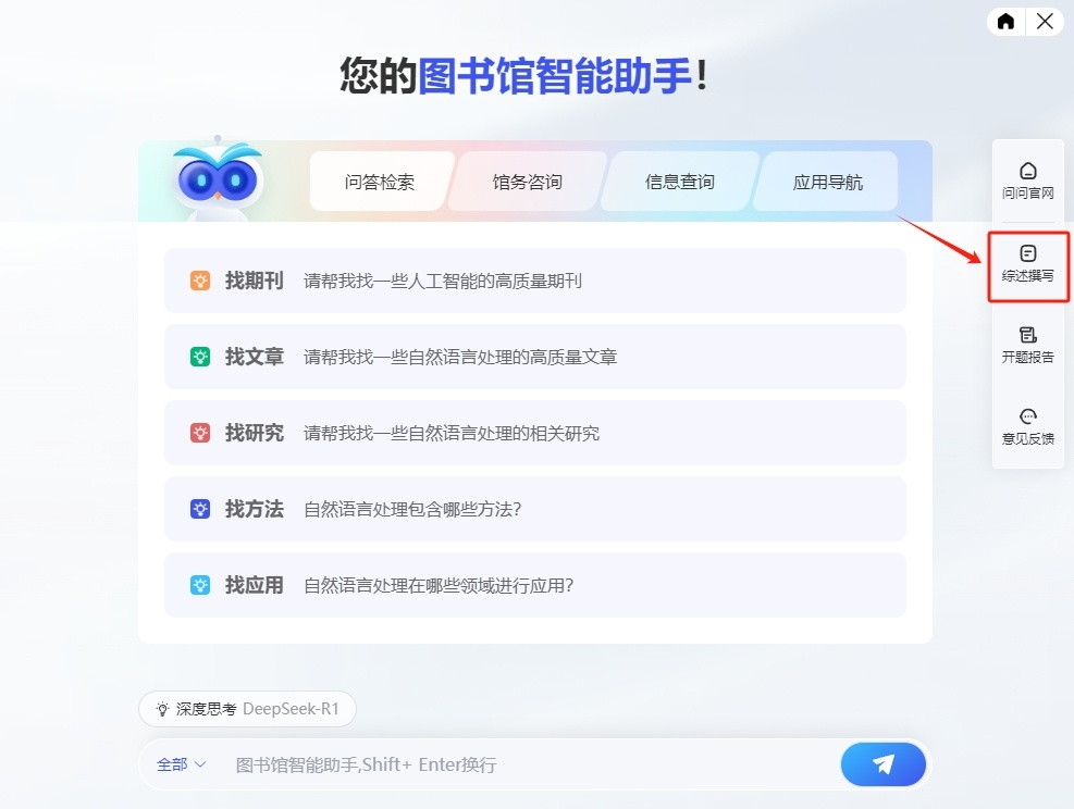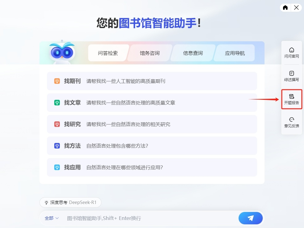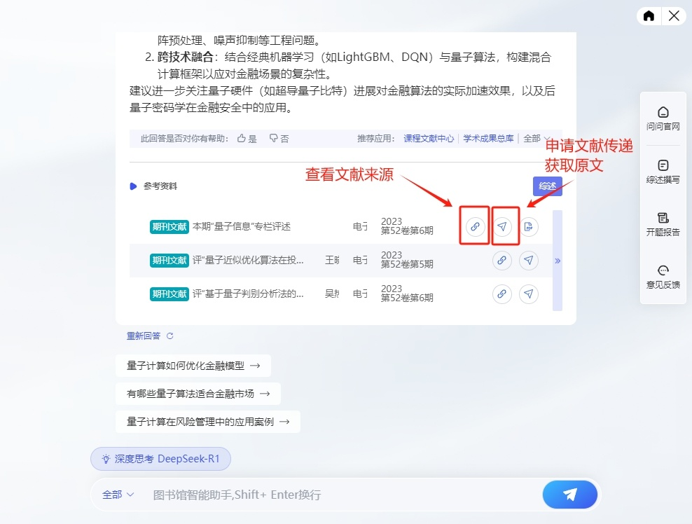 “问问”有哪些功能和服务呢?那可太哇塞啦!“问问”已接入DeepSeek R1满血版,拥有超强的问题拆解能力和数据分析能力,回答问题更聪明!同时,“问问”内置海量学术文献,等你探索!更有知识问答、问答检索、文献保障、文献综述、信息查询、馆务咨询、文献研读、开题报告等超多实用功能,等你体验!快来get使用攻略吧~