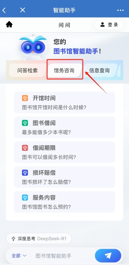 问问24小时全天候在线,你可以随时随地向它提问,了解馆务服务,如: