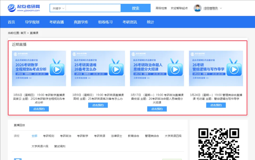 直播课结束后,可登录起点考研网观看回放视频(注:注册登录后才可观看视频)