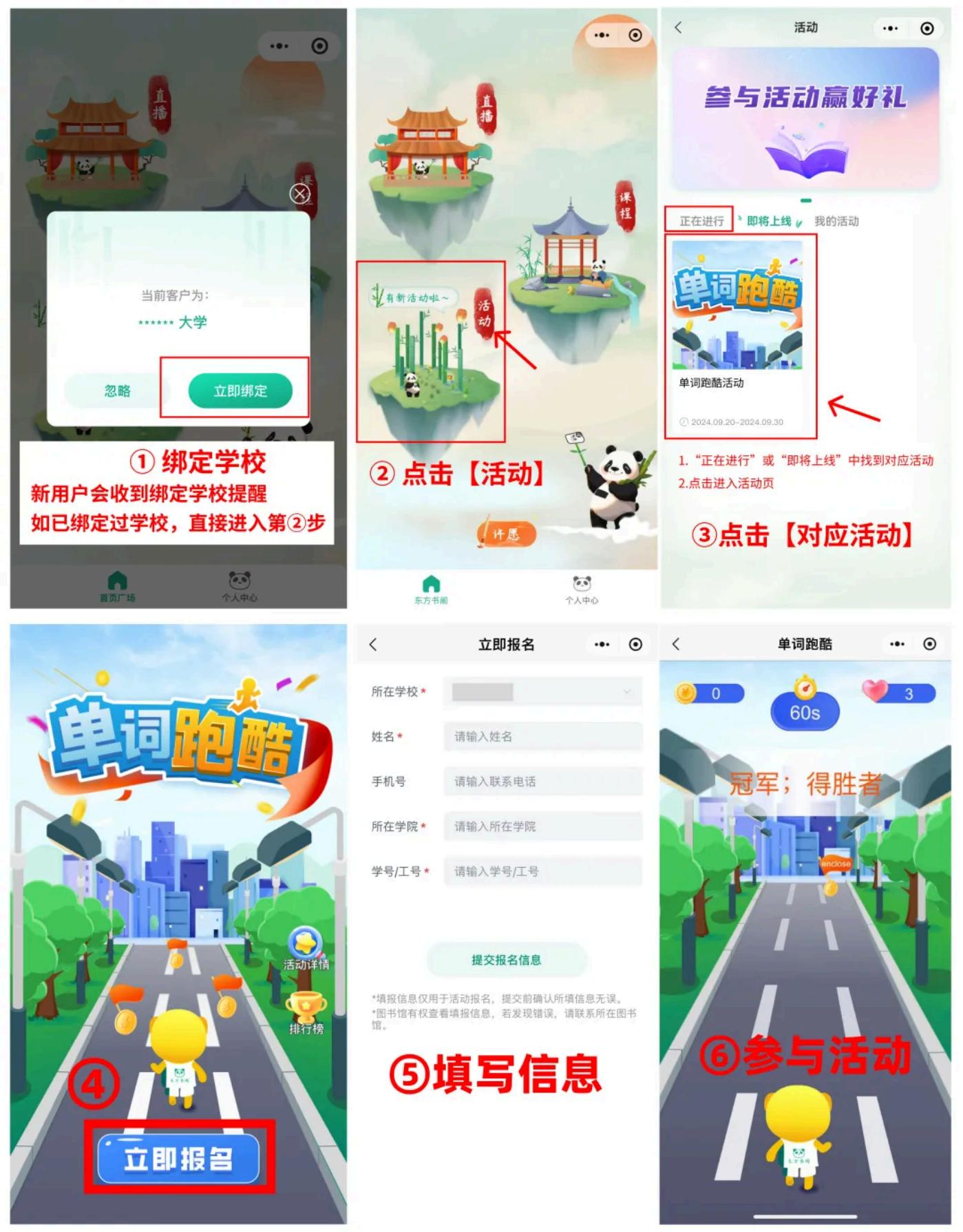 为了帮助同学们测试英语单词熟练度 ,提⾼英 语单词拼写能⼒ 、扩充词汇量 , 图书馆特联合 新东⽅多媒体学习库开展单词跑酷活动。