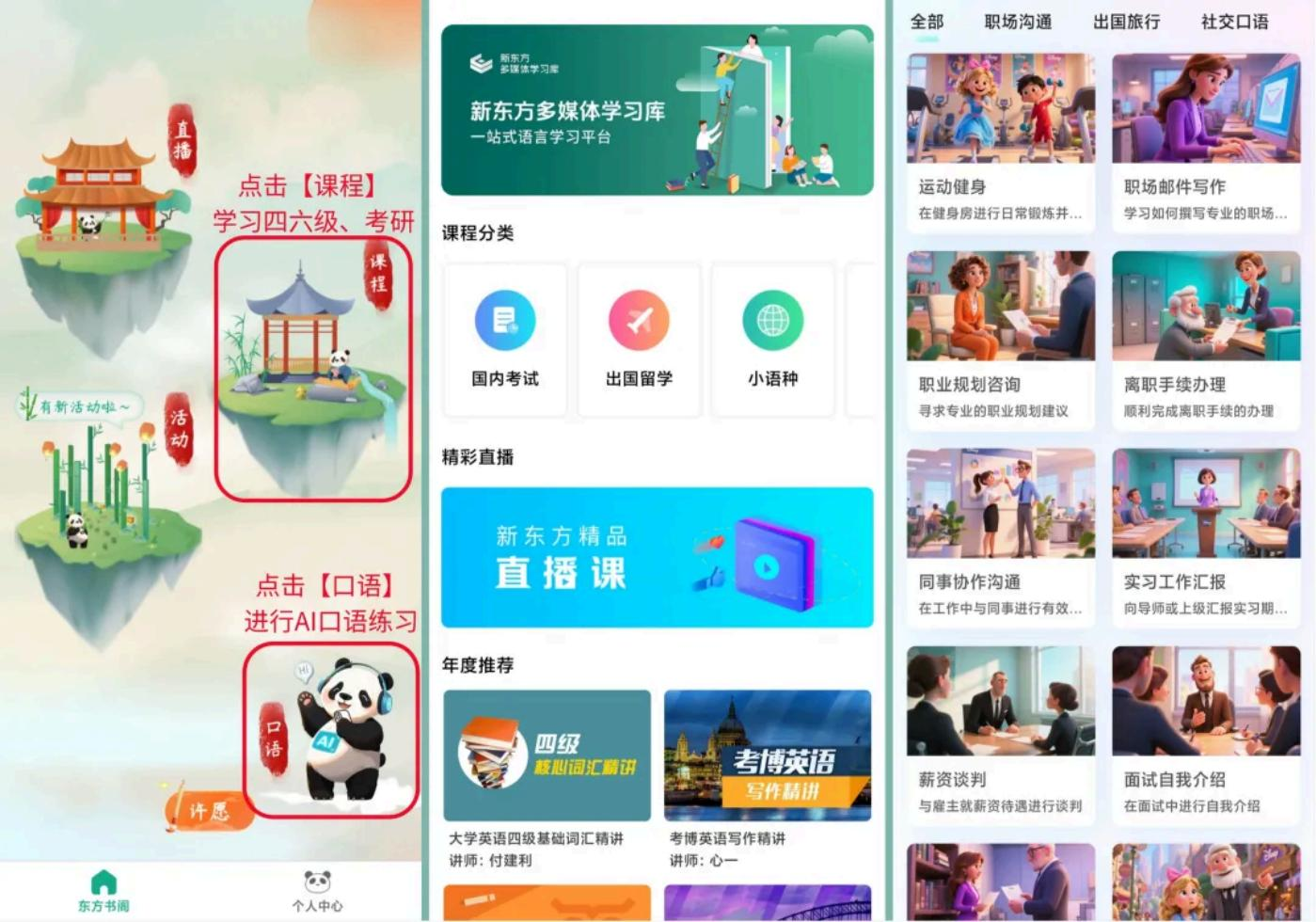也可以在⼩程序 【课程】 和 【⼝语】 板块中访问新东⽅多媒体学习库资源和进⾏AI⼝语练习。