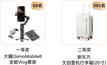 个⼈奖项抽取流程:活 动 结 束 后 统 ⼀ 开 奖 , 按 照 ⼀ 等 奖 、 ⼆ 等 奖、 三等奖的顺序 , 依次从满⾜获奖资格的参与者中随机抽取获奖者。每位参与者在整 个 活 动 中 仅 有 ⼀ 次 获 奖 机 会 , 不 可 重 复 中 奖。