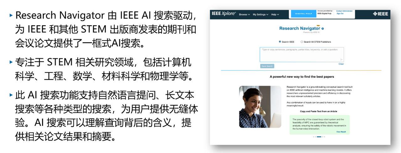 这些功能能帮助用户轻松检索和发现来自 IEEE 及其他 STEM 领域出版商的相关文章,加快对单篇论文的理解,并获得新的见解。全新的AI工具,支持自然语言查询,其人工智能驱动的搜索功能可提供准确的相关结果,具体包括: