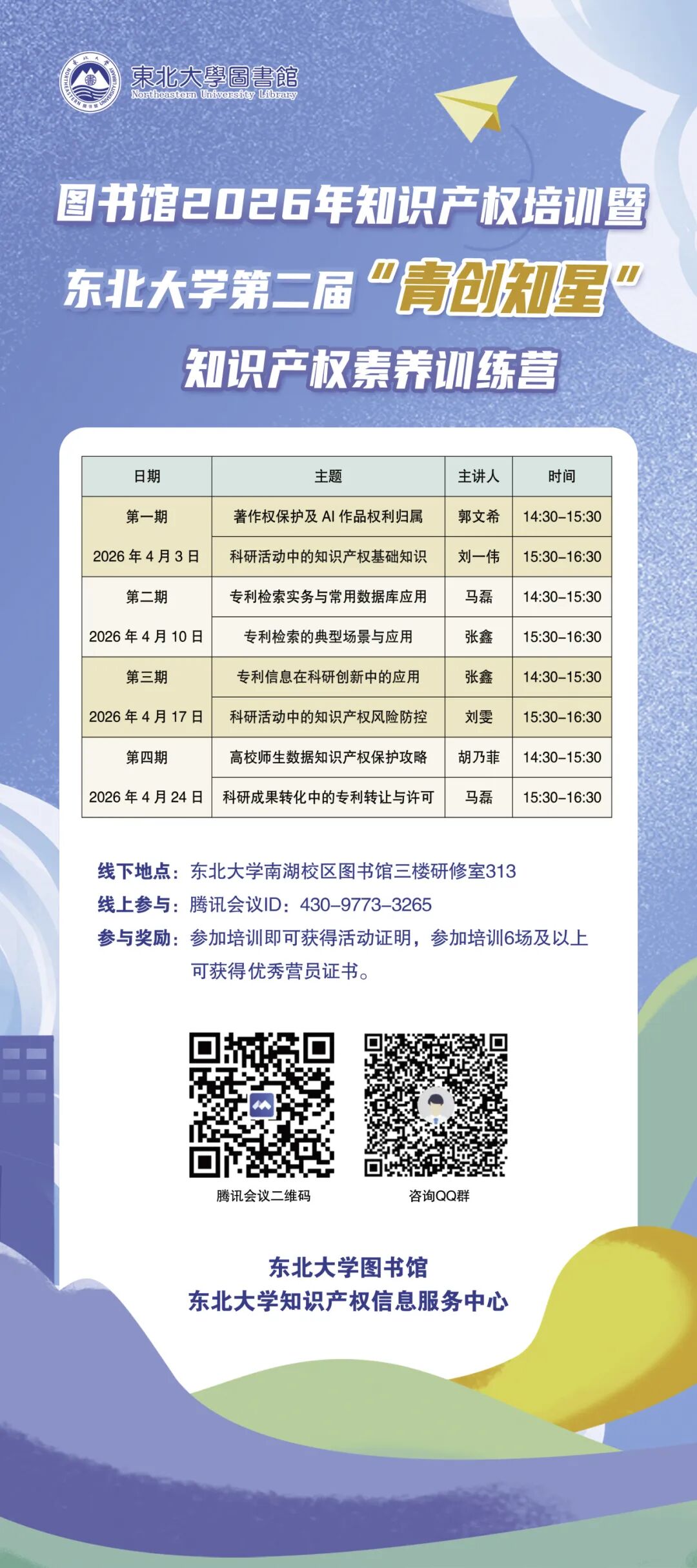 知识产权既是守护智慧成果的坚实屏障,也是支撑科研创新的重要手段。面对科研创作中的权利归属、专利检索中的方法困惑、信息应用中的实操难题以及风险防控中的细节盲区,如何熟练运用相关知识和技能破解难题,已成为高校师生的必备素养。为此,东北大学图书馆重磅推出2026年知识产权培训暨第二届“青创知星”知识产权素养训练营!