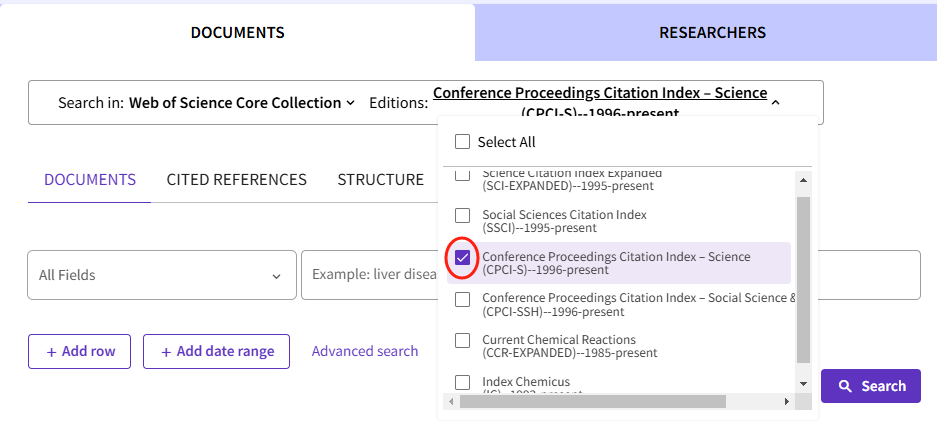 检索CPCI-S的读者,请在search in 选项中选择“Web of science core collection”,在其后的Editions选项中仅选择“Conference Proceedings Citation Index - Science (CPCI-S)”,去掉其他勾选,否则检索结果将包含以上全部数据库的数据。
