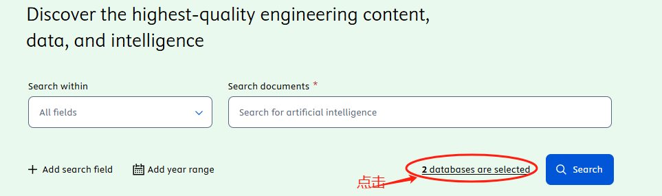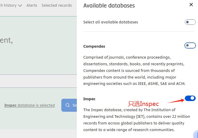 特别提示:在Engineering Village平台上,可以同时检索以下两个文摘索引数据库:Ei Compendex、INSPEC,系统默认跨库检索,如果只检索INSPEC,请把其它数据库去掉。如图所示: