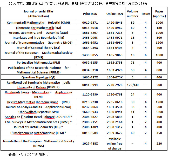 EMS出版的研究期刊涵盖了整个数学领域,既有基础理论研究,也有应用研究,内容丰富而全面,在高等研究领域非常著名,2013年已出版的15种学术型期刊中,80%被SCI收录为核心期刊。根据期刊引用报告(JCR)统计,其中Journal of the European Mathematical Society (JEMS)、Journal of Noncommutative Geometry (JNCG)的影响因子分别高达1.736和1.296。