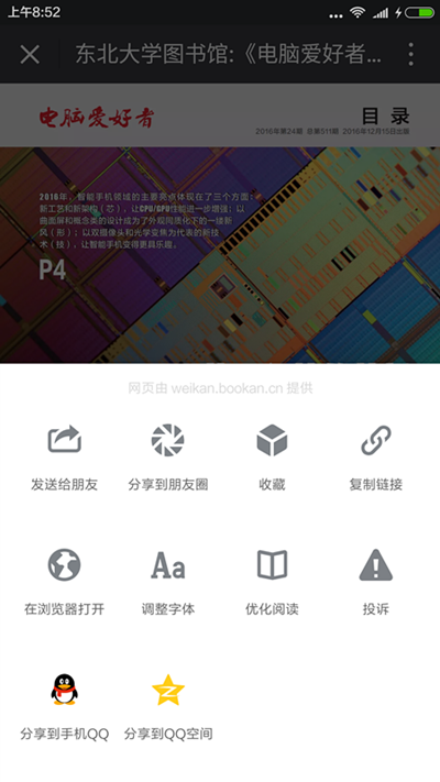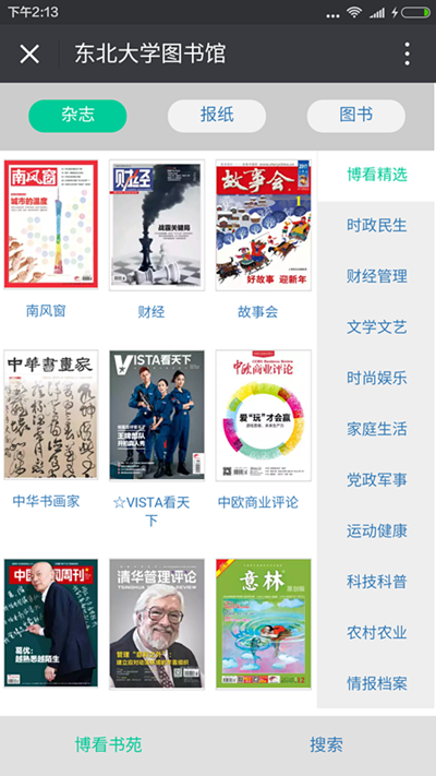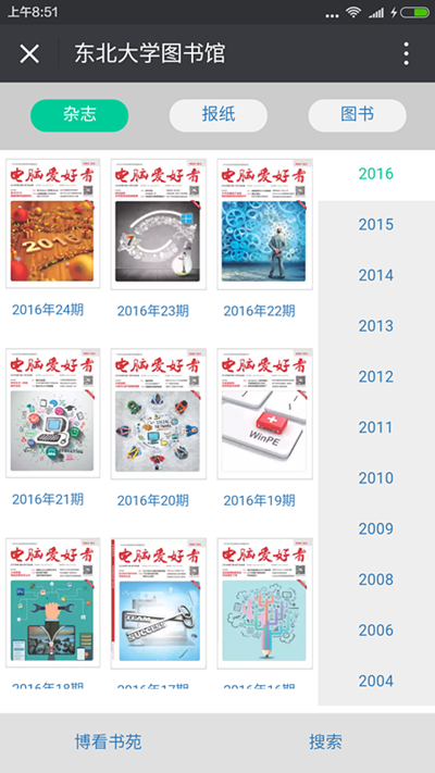 博看期刊数据库,在原有数据服务的基础上,将3000多种精品期刊和5000册精品图书进行多次加工和技术处理后,为图书馆的微信公众号提供微刊阅读专区,读者只要关注图书馆微信公众帐号,就可以自由读阅博看3000多种精美人文畅销期刊。不但可以看到当期,还可以看到往期,既能实现收藏检索等功能,还可以把喜欢的期刊分享给微信好友,QQ好友,朋友圈。在原有博看期刊移动APP阅读的基础上得到了大幅度的提升。