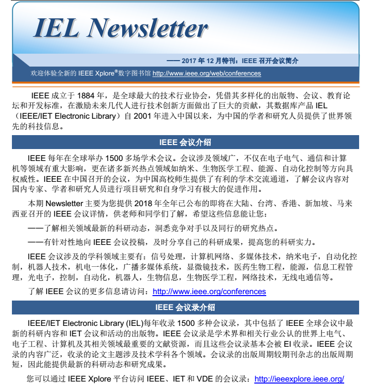 本期Newsletter主要为您提供2018年全年已公布的即将在中国大陆、中国台湾、中国香港、新加坡和马来西亚等国家地区召开的IEEE会议详情,供老师和同学们了解。通过本期特刊您可以了解相关领域最新的科研动态,洞悉竞争对手以及同行的研究热点。并且有针对性地向IEEE会议投稿,及时分享自己的科研成果,提高您的科研实力。