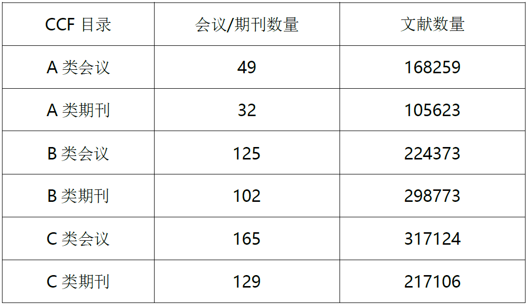 数据库基于CCF 中国计算机学会推荐目录收录的ABC 类目下339 种会议来源以及263 种 核心期刊来源,累计收录核心文献论文100 万篇。其中会议论文数据收录年限1960-2019 年,期刊论文数据收录年限1929-2019 年,文献数据每周自动更新。