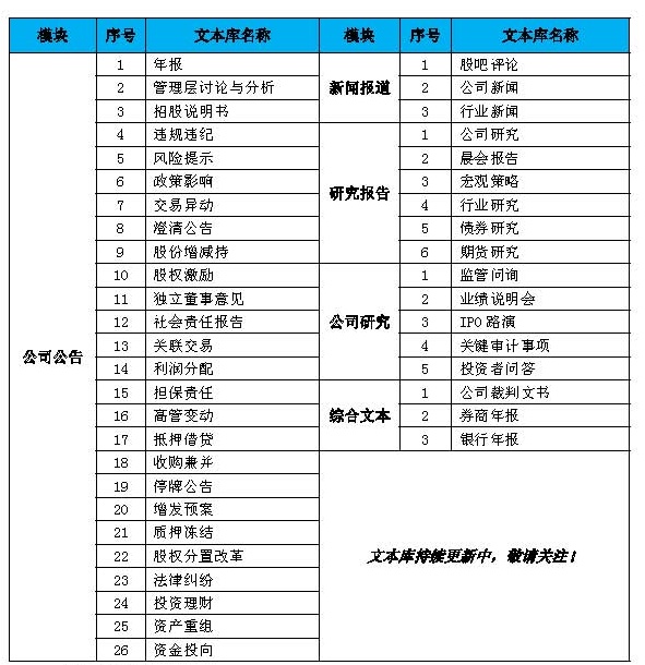 资源库系统简介: 爱文本智能文本分析系统(AITEXTS)专注于为广大科研人员和业界投资人士提供精确、高校和便捷的文本分析工具和服务,致力于帮助客户深度挖掘文本信息,获取诸如文本词频、语调情感、文本可读性、文本相似度等文本分析结果,事先科研和投资的智慧化。 访问地址: www.aitexts.com 试用期限:2021年9月28日-2022年3月27日 访问方式:在校园网内/校外VPN使用试用账号登录平台主页即可 试用账号:用户名:neu.edu.cn 密码:hf86JH(已绑IP,校外通过VPN访问) 适用对象:①从事文本研究方向的师生; ②利用文本数据构建投资决策的金融从业者。 使用范围: 主要提供时间范围为三年的数据,具体以文本库展示内容为准。 文本内容: